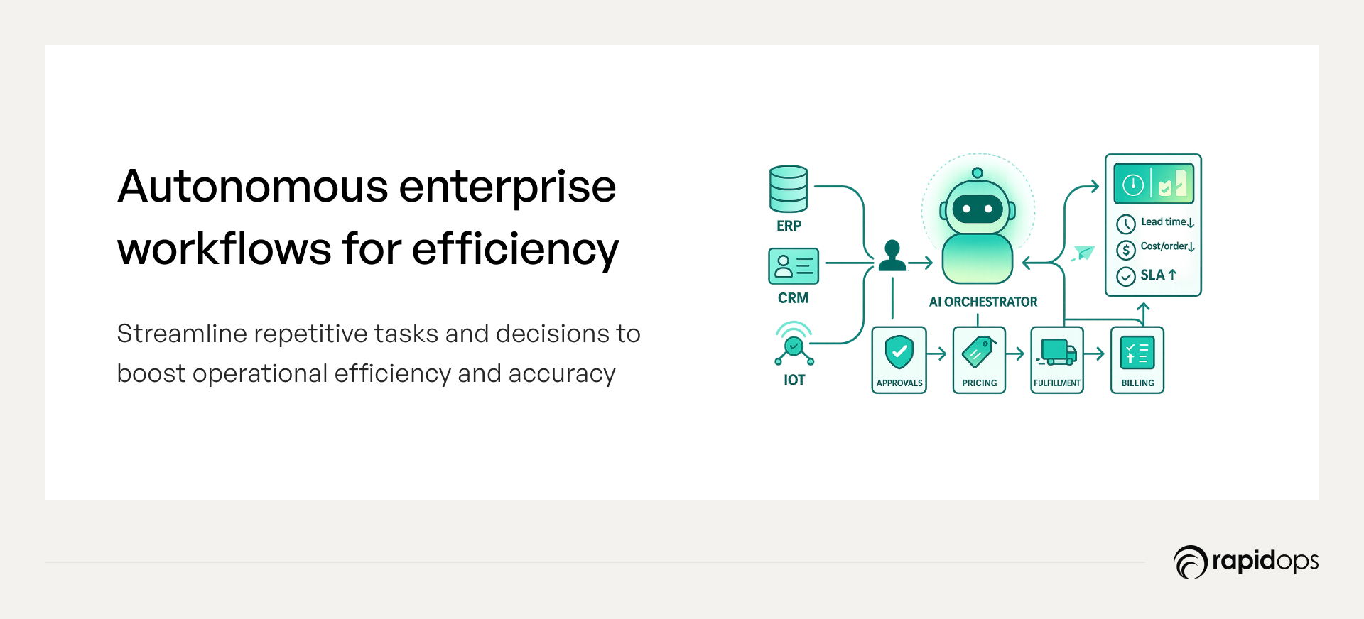 Routine operational tasks such as approvals, order processing, reporting, and internal communications are executed autonomously by AI agents. These agents follow predefined rules while adapting dynamically to changing conditions, acting in real-time to maintain workflow continuity and operational accuracy. By managing routine processes, they free human teams to focus on strategic initiatives and high-value work.