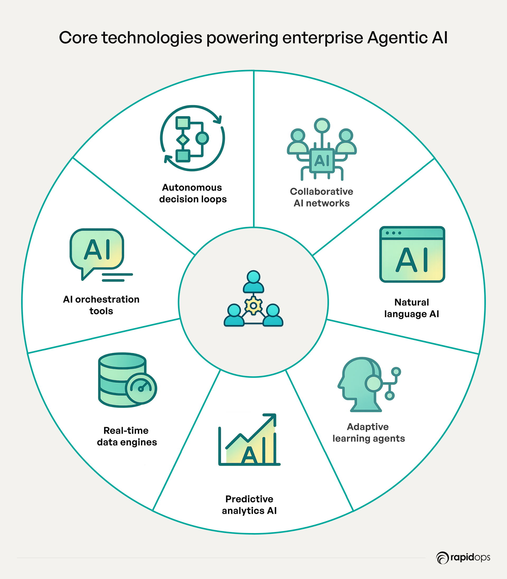 Agentic AI’s transformative impact relies on a robust set of AI capabilities that empower enterprises to act with intelligence, agility, and precision. In 2025, these technologies are actively shaping how organizations perform tasks, manage complex problems, and achieve business goals. Understanding these core technologies is essential for leaders aiming to maximize business value through agentic AI systems.