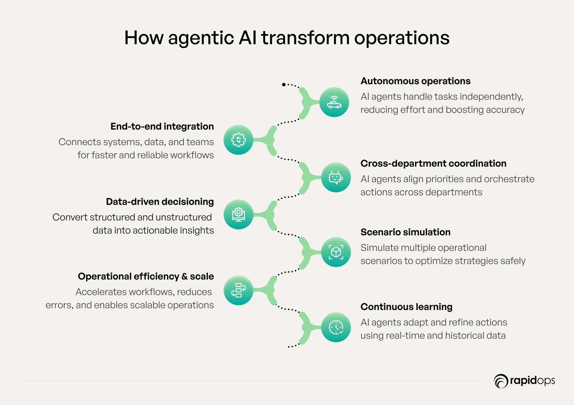 By converting dispersed enterprise data into coherent, actionable intelligence, agentic AI enables organizations to gain a strategic advantage, foster cross-functional alignment, and support adaptive, informed decision-making at scale. As agents coordinate knowledge across silos, emergent intelligence drives continuous learning and collective enterprise adaptation, further reinforcing agility and resilience.