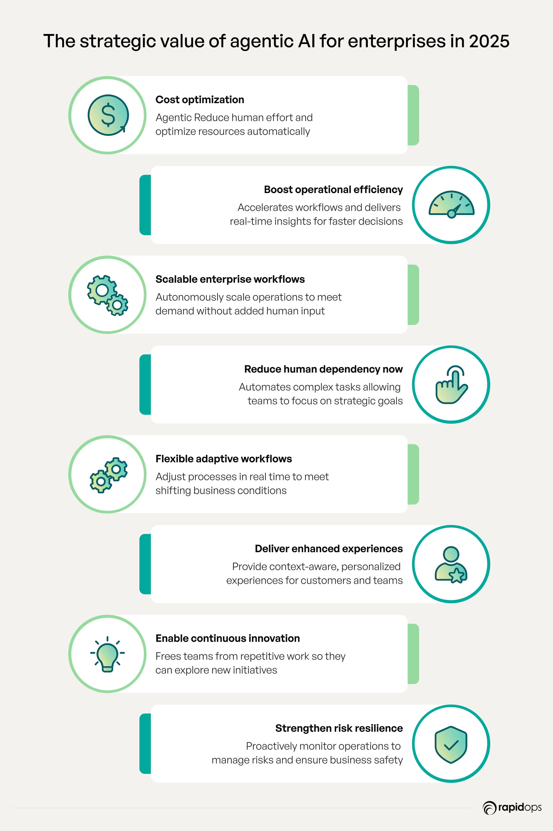 Rising operational overhead and unpredictable market conditions make efficient resource management essential. Agentic AI systems handle both routine and complex tasks autonomously, reducing human effort and minimizing errors. This allows teams to focus on strategic initiatives, innovation, and high-value projects, while organizations optimize costs and achieve better resource utilization across core workflows.
