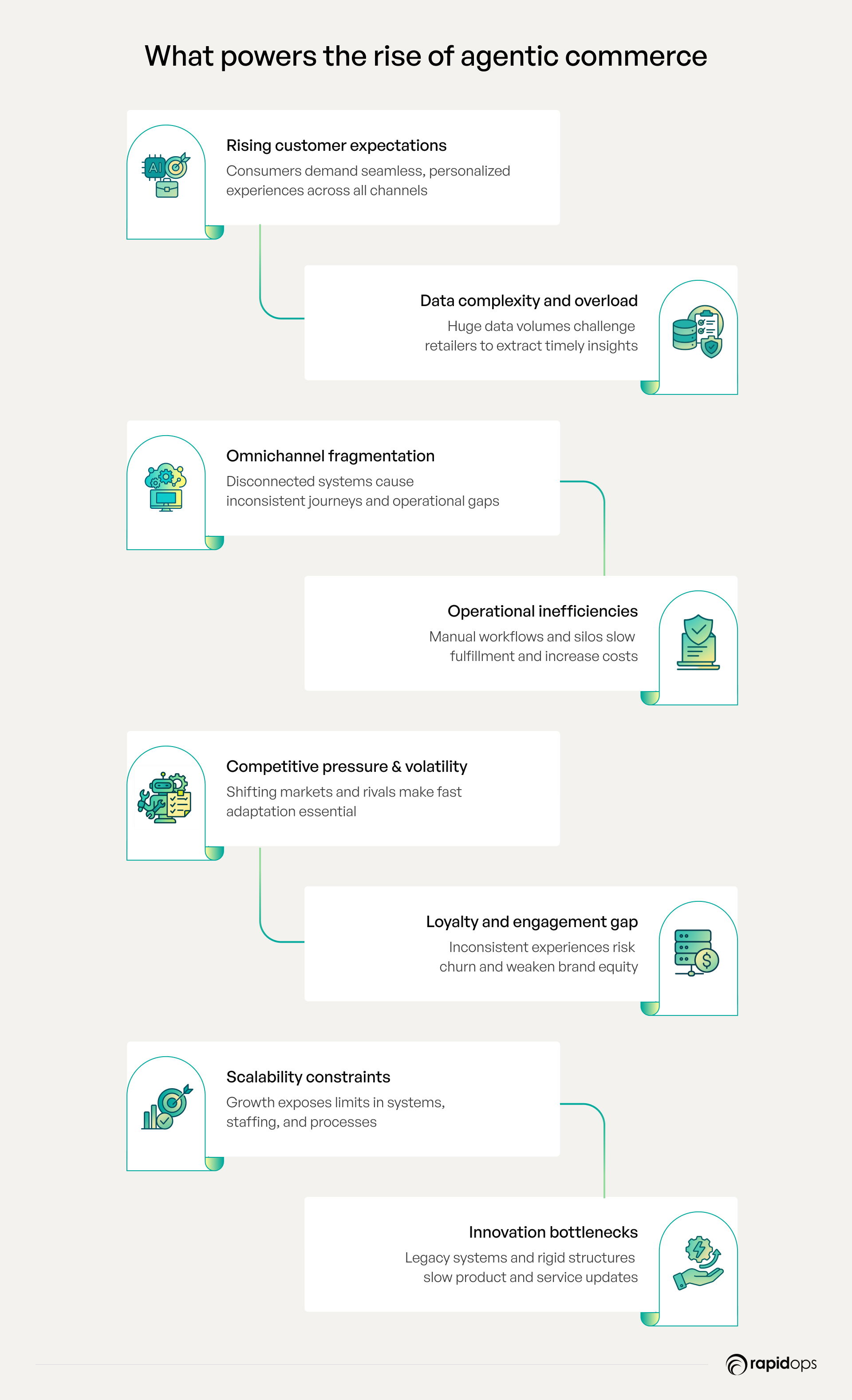 The rise of agentic commerce is fueled by structural pressures, operational complexity, and market dynamics that retailers face today. Understanding these drivers is essential for leaders to anticipate challenges, prioritize strategic initiatives, and maintain competitive positioning in an increasingly digital, customer-centric, and data-driven retail ecosystem.