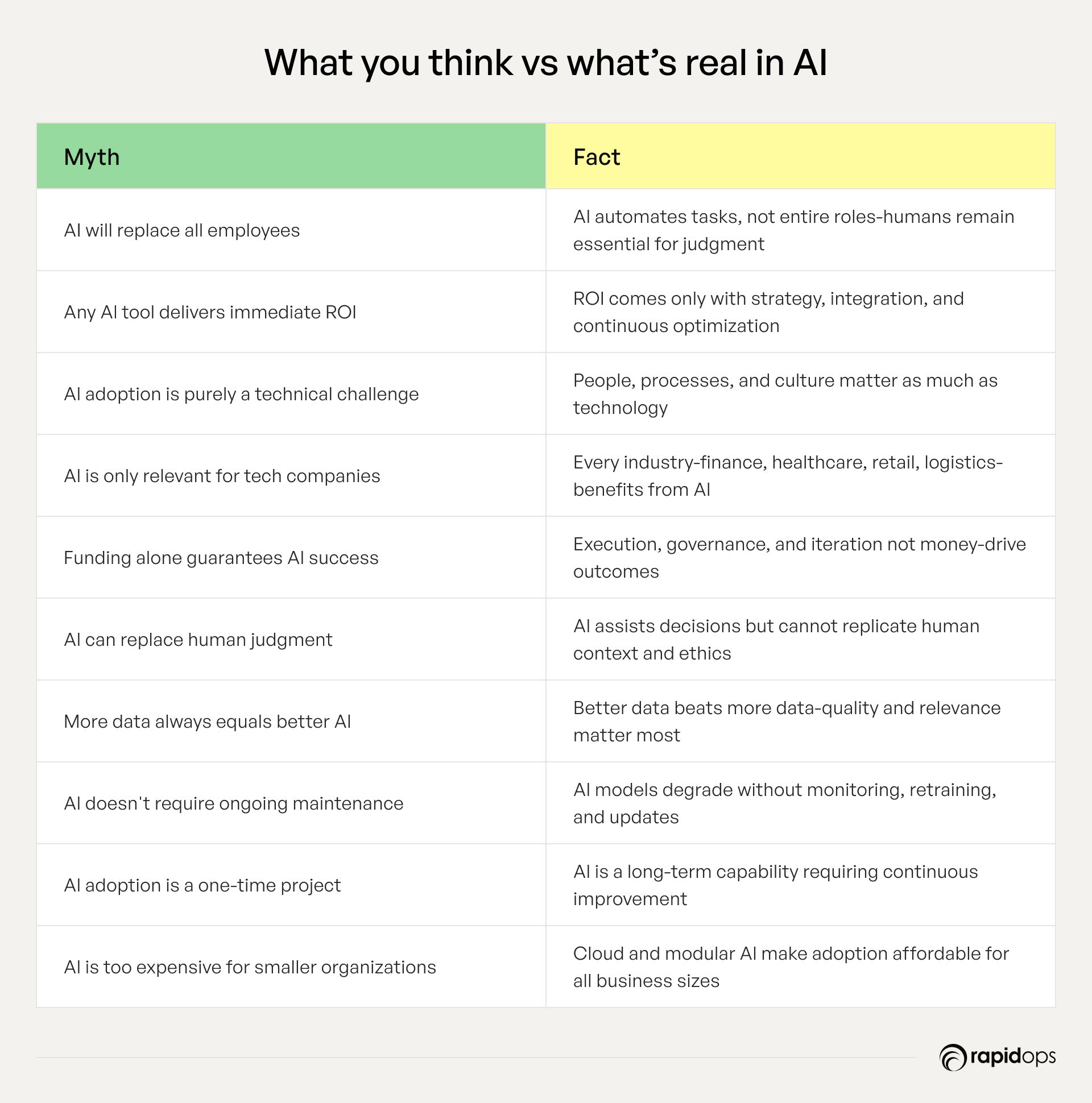 AI adoption continues to generate immense interest across industries, yet misconceptions frequently lead to misaligned expectations, stalled initiatives, and underwhelming outcomes. For leaders, understanding the reality behind these myths is critical to unlocking AI’s full potential, ensuring initiatives are strategically aligned, operationally feasible, and capable of delivering measurable enterprise value.