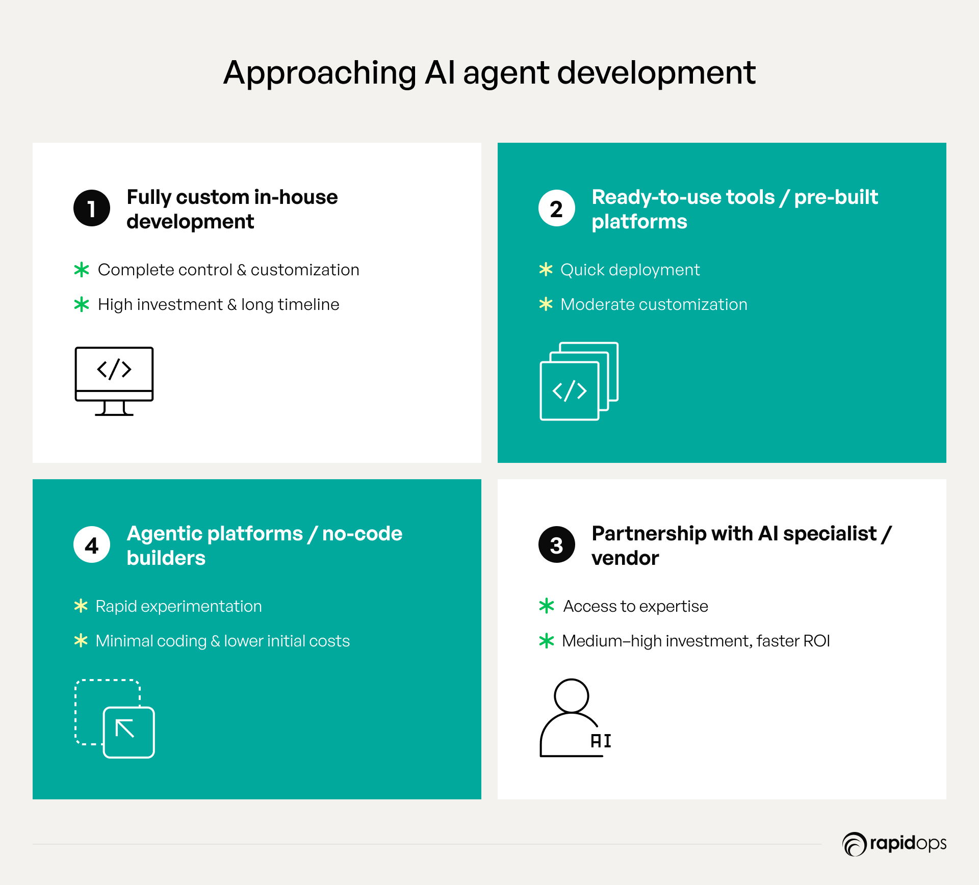 Selecting the right approach for AI agent development is critical to achieving measurable business value. Your choice impacts functionality, scalability, timelines, ROI, and operational efficiency. By understanding the types of AI agents, enterprise decision-makers can tailor their development strategies. This includes building an AI agent fully in-house, leveraging pre-built tools, partnering with AI development services providers, or deploying agentic AI platforms, while also managing hidden costs, ongoing maintenance, and operational expenses.