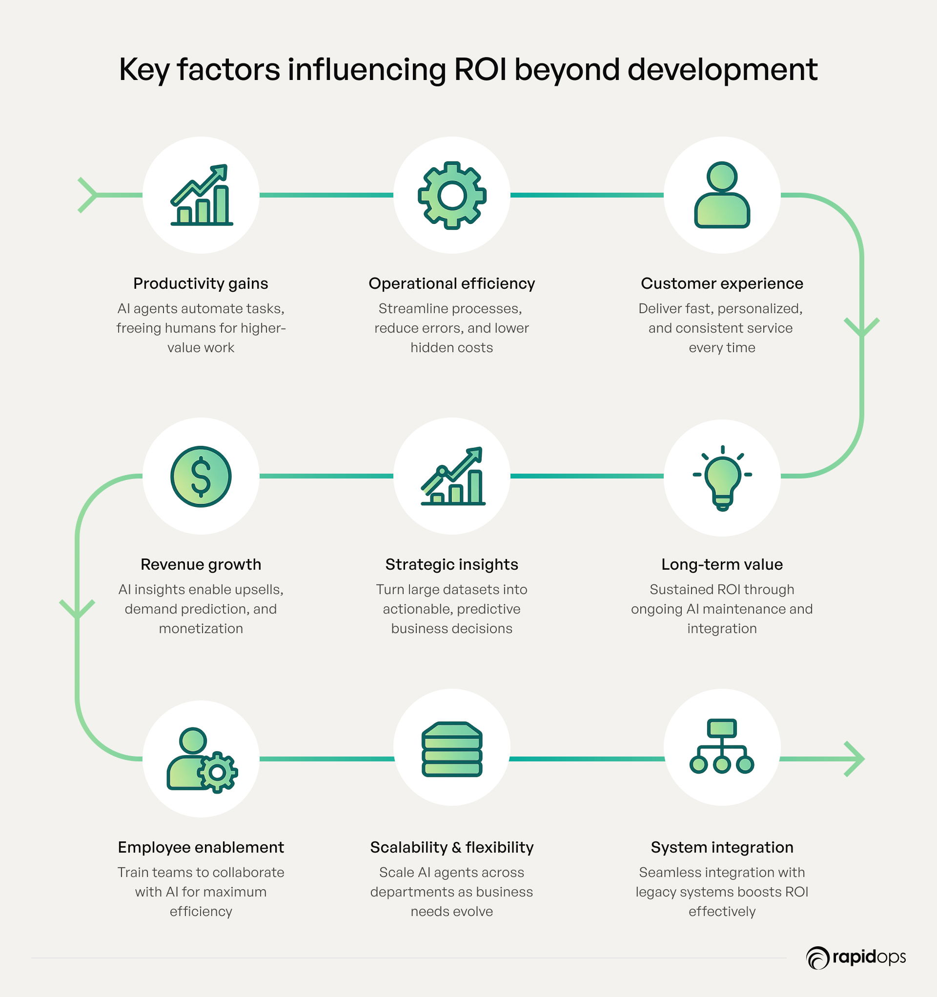 When evaluating AI agent initiatives, true ROI extends far beyond initial development costs. Enterprises that focus solely on building AI agents without considering operational impact, employee adoption, and system scalability often miss the full spectrum of value. Understanding the broader factors that influence ROI empowers decision-makers to make informed choices that enhance both financial and strategic outcomes.