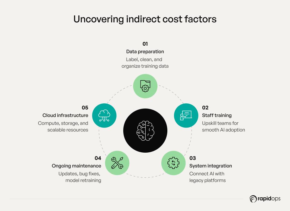 AI agents rely on scalable infrastructure. Compute costs, cloud storage, and resources required for model training, and pre-trained models contribute to indirect expenses. Enterprises must account for these costs to maintain performance, support multi-agent systems, and optimize agent development cost across the AI lifecycle.