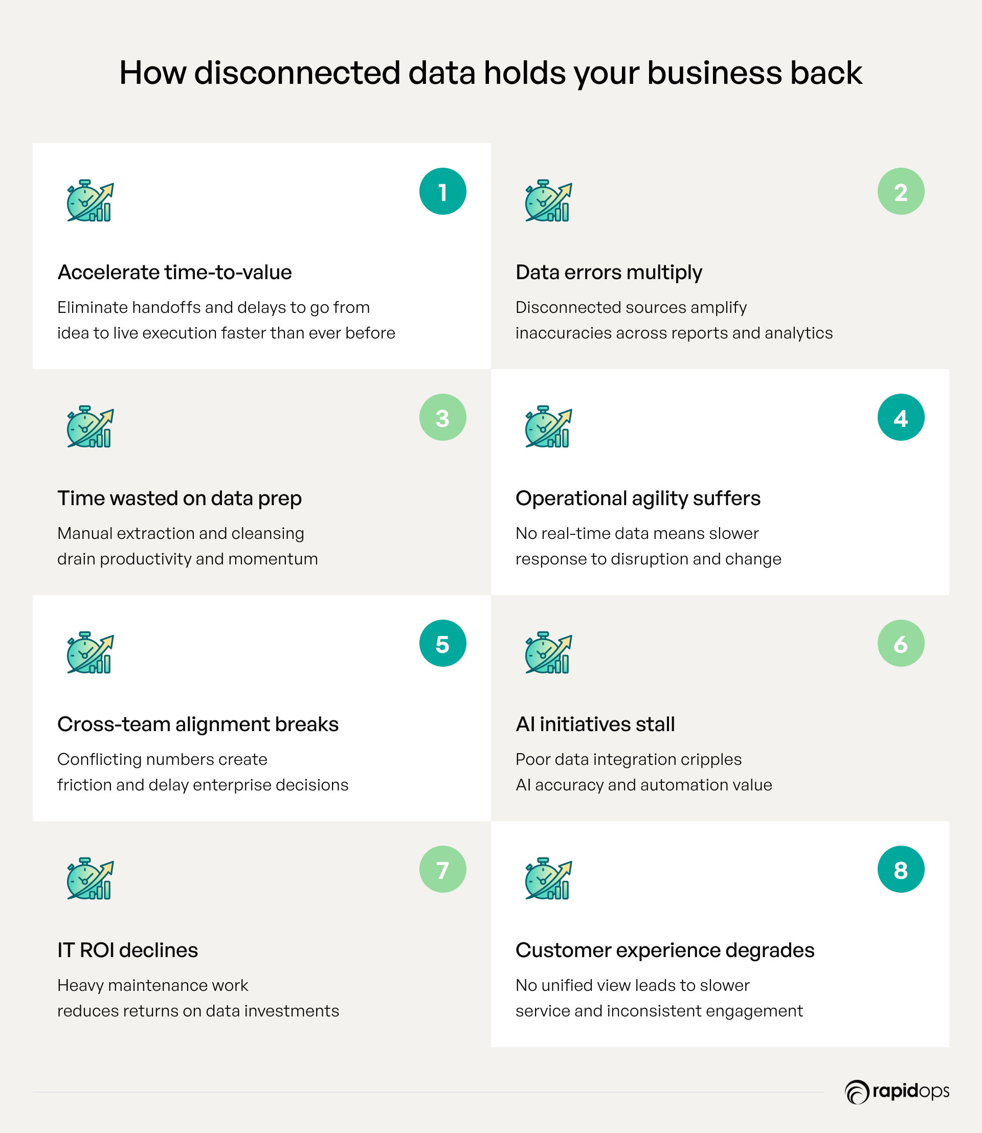 Disconnected data integration systems block real-time visibility across operational, financial, and customer data. Without real-time data integration or data virtualization, organizations cannot respond quickly to supply chain disruptions, market changes, or internal bottlenecks. As enterprise data doubles every 12–18 months, operational delays compound, creating inertia. Teams face slower forecasting, longer production cycles, and reduced responsiveness, directly impacting revenue and market competitiveness.