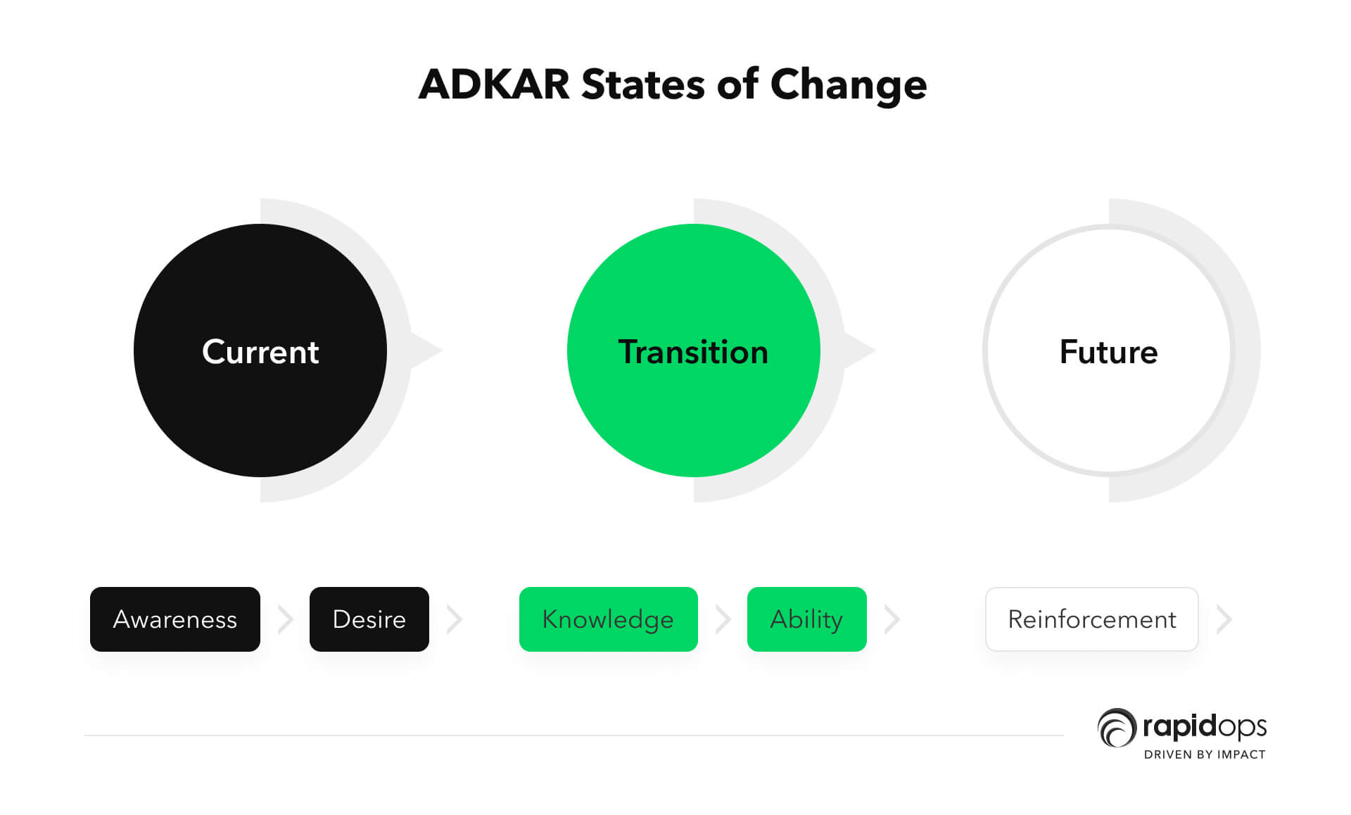 The ADKAR states of change enable leaders to understand organizational change as a process by breaking it down into three stages.