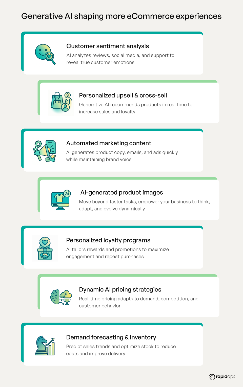 Generative AI in eCommerce is transforming how businesses operate, engage customers, and maximize revenue. Its applications extend far beyond personalization and product discovery, impacting marketing, pricing, visual content, loyalty, inventory management, and customer insights. By leveraging generative AI, companies can automate complex tasks, make data-driven decisions, and deliver hyper-relevant experiences that delight shoppers while driving measurable business outcomes.