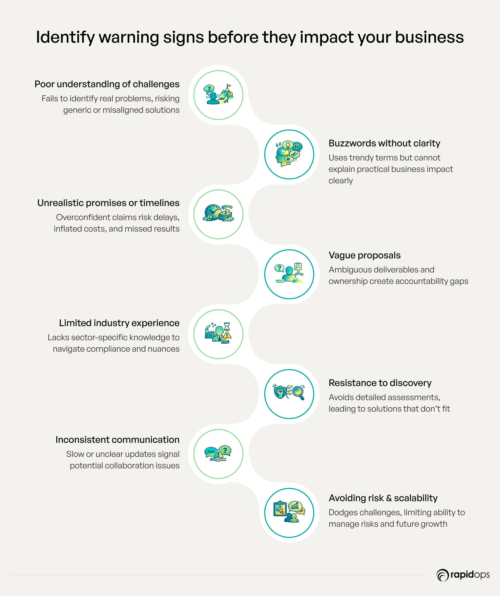 Claims of immediate ROI or overnight transformation are red flags. Partners overconfident in their execution often underestimate complexities, which can result in missed expectations, inflated costs, and delayed benefits. By identifying this early, you can prioritize partners who provide transparent, phased approaches with measurable milestones.