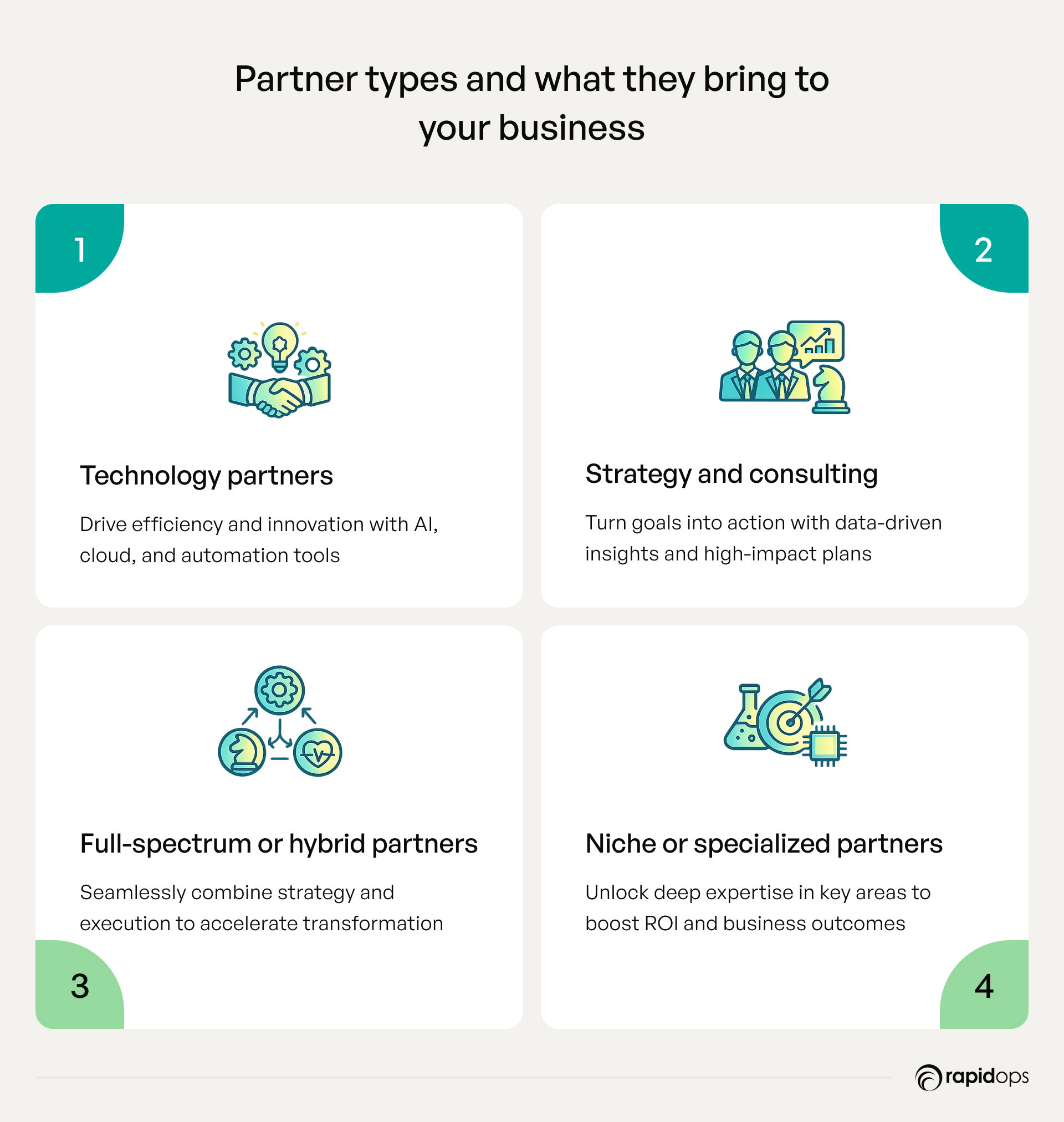 When you clearly understand partner types and their capabilities, you can align your choices with your business goals and transformation objectives.