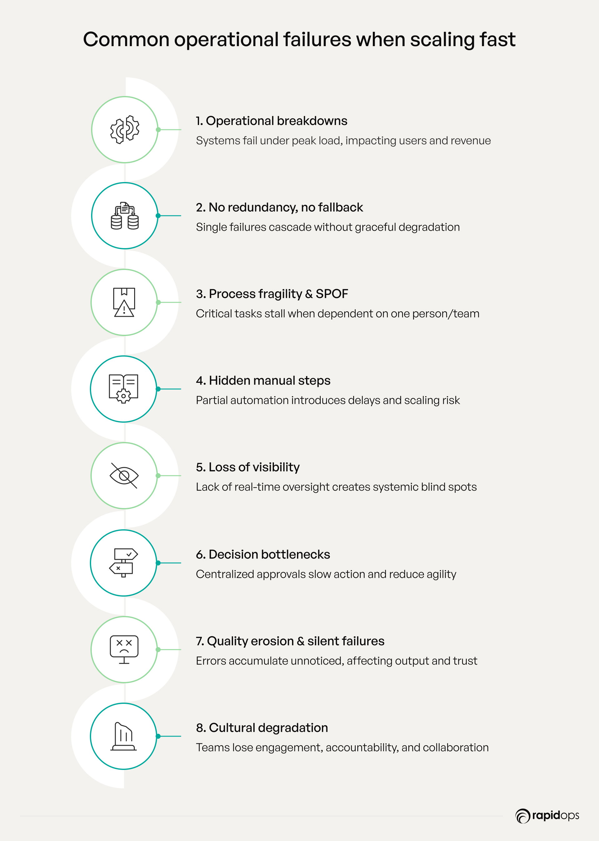 These failures are not random; they are the predictable result of systems, processes, and cultures that were never designed for scale. Recognizing and addressing these patterns proactively allows organizations to avoid costly breakdowns, maintain quality, preserve team morale, and grow sustainably, turning scaling from a risk-laden challenge into a controlled, strategic advantage that supports both operational and business objectives.