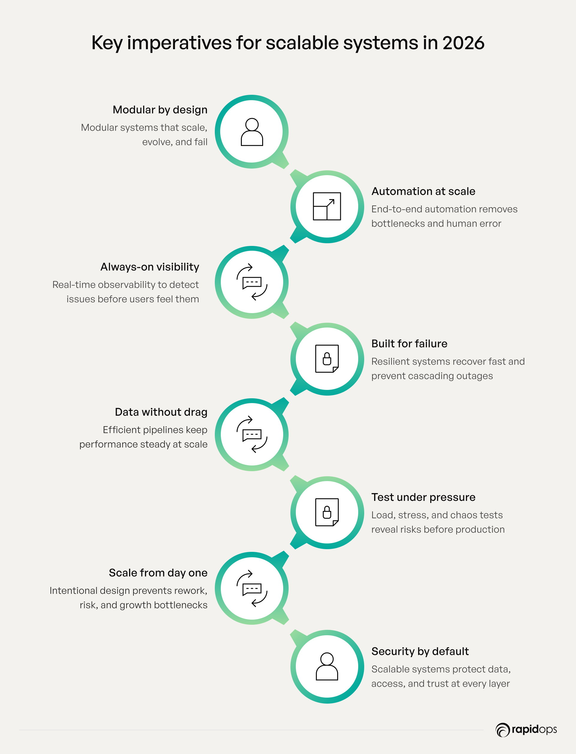 In 2026, scalable systems are no longer about handling growth alone; they are about sustaining reliability, adaptability, and control under constant change. Organizations must support rising user expectations, AI-driven workloads, distributed teams, hybrid and multi-cloud environments, and real-time decision-making without compromising stability. Scaling has become a systemic discipline, not a reactive fix.