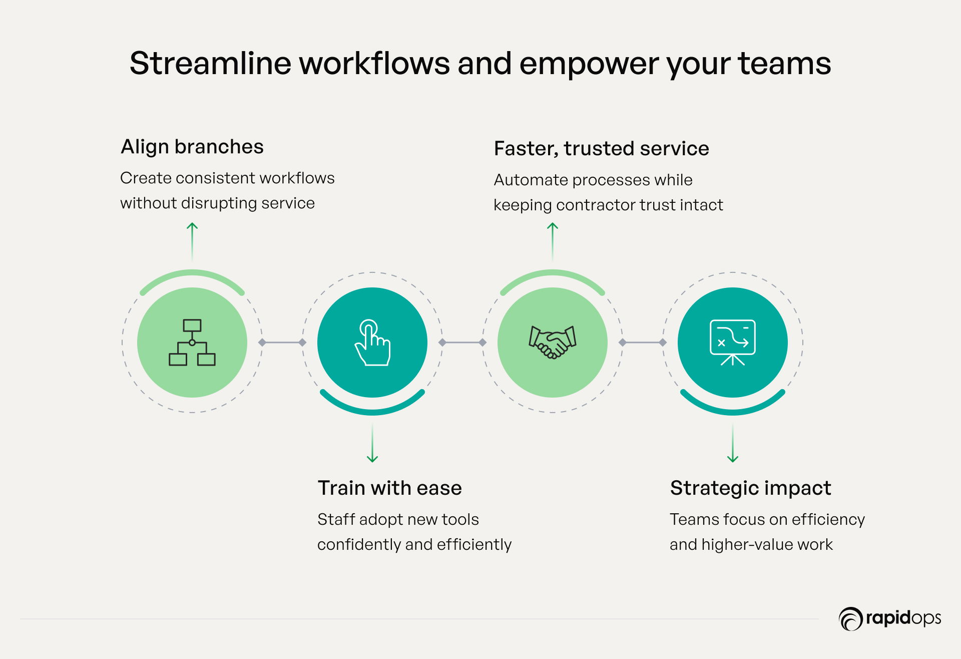 By removing routine operational burdens, modernization allows teams to operate at a higher level of strategic influence. Staff can focus on driving efficiency, optimizing branch operations, and enhancing contractor experience. The result is a workforce that leverages both technology and institutional knowledge to deliver measurable business impact.