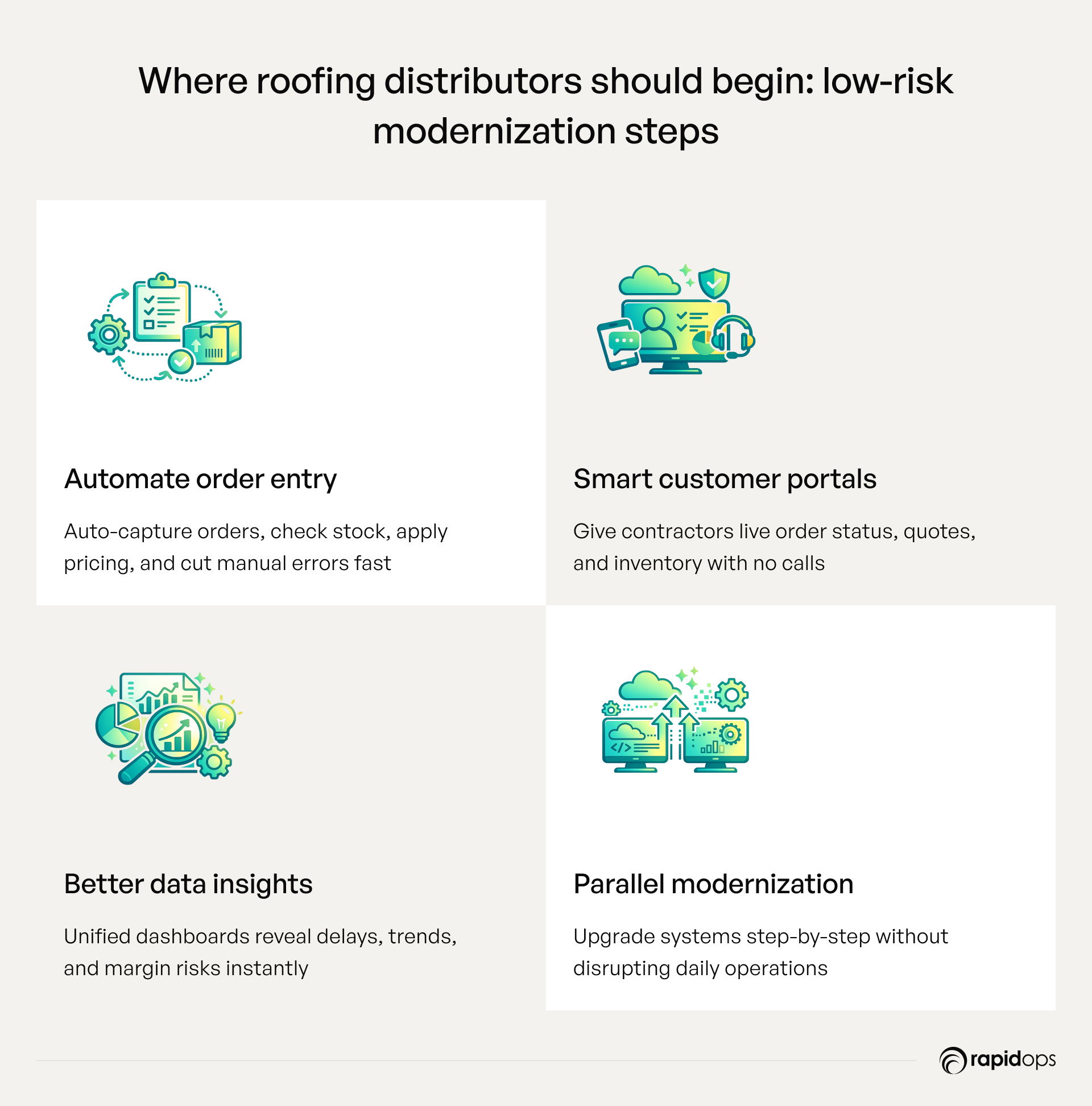 Many roofing distributors are just starting to explore modernization and may be unsure where to begin. A practical approach is to focus on small, low-risk initiatives that improve efficiency, reduce errors, and increase visibility, while keeping existing ERPs and workflows intact. These first steps help uncover inefficiencies, streamline operations, and create a foundation for sustainable growth, all without disrupting day-to-day business.