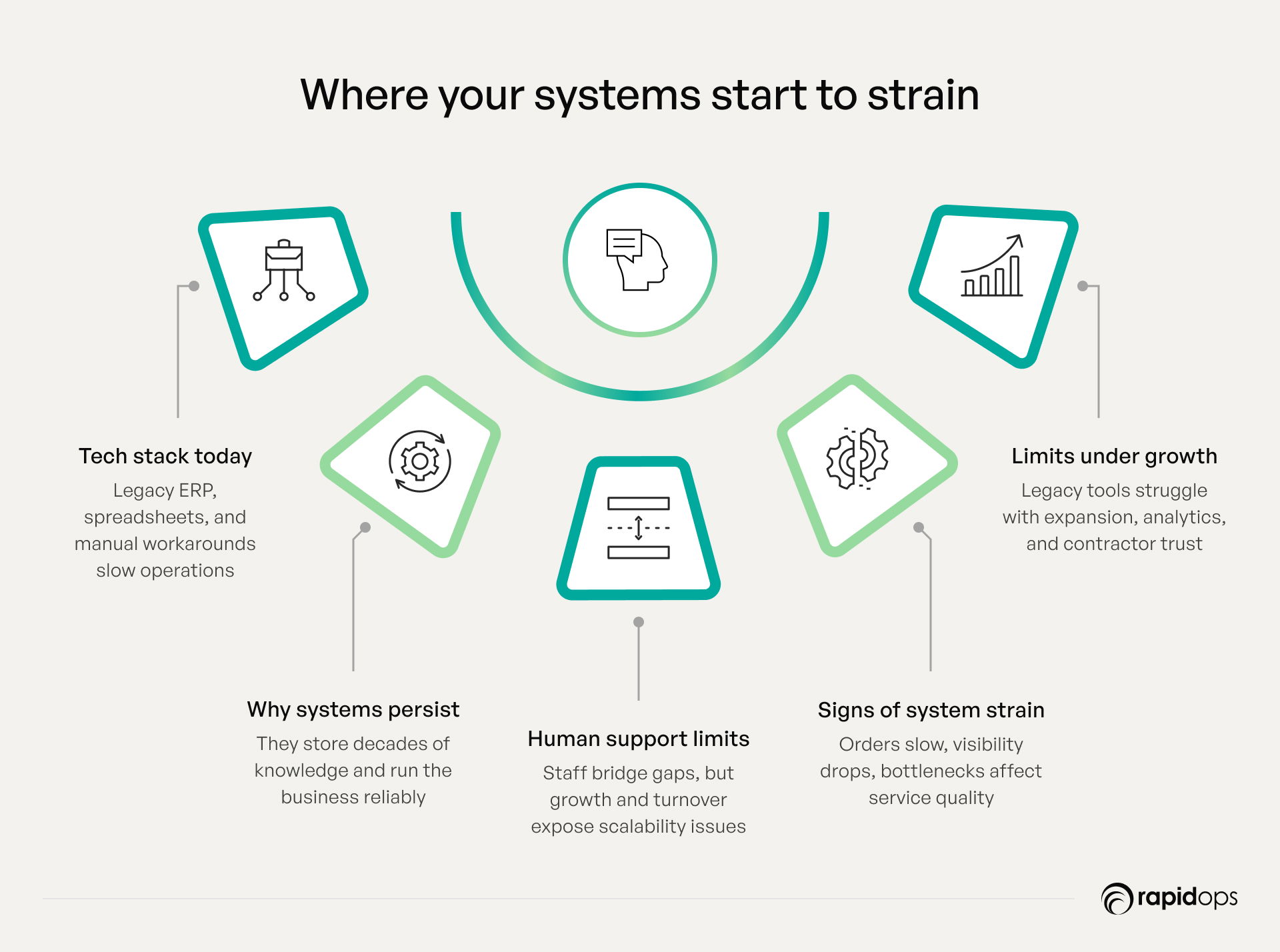 Branch managers, planners, and sales teams act as the glue bridging gaps in your systems. Their expertise ensures continuity, but this human dependency has limits. Knowledge resides in people, not fully in your systems, which means scalability is constrained as volume grows, new branches are added, or turnover occurs. Without processes to codify this knowledge into systems, you risk inconsistent execution, slower onboarding, and uneven contractor experiences, making modernization necessary to scale efficiently without losing operational reliability.