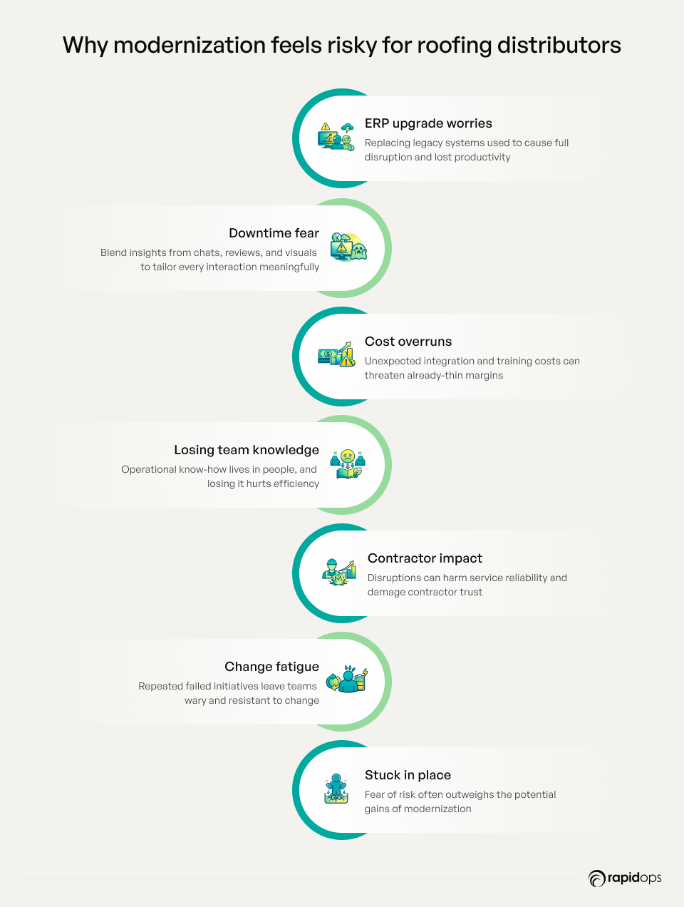Modernization carries a reputation that often precedes it: disruption, risk, and uncertainty. For many roofing distributors, the thought alone triggers concern: What if operations slow, teams resist, or margins are eaten away? The reality is different: modernization today doesn’t have to be a gamble. To take the first step confidently, you need to understand why it feels risky and why these fears are so deeply ingrained.