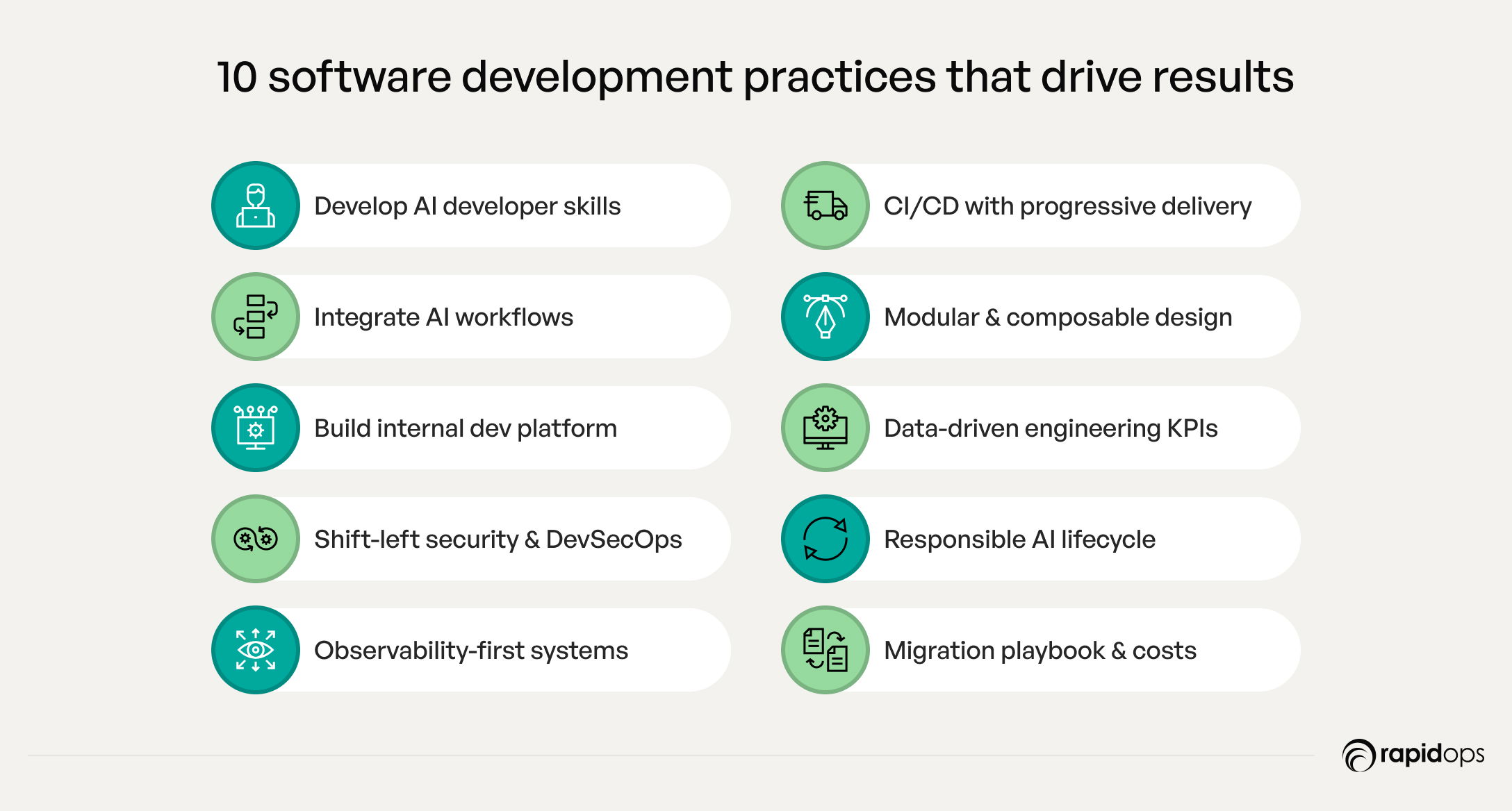 - Pilot low-risk workflows: Start small to measure AI impact on software development practices and overall delivery speed.