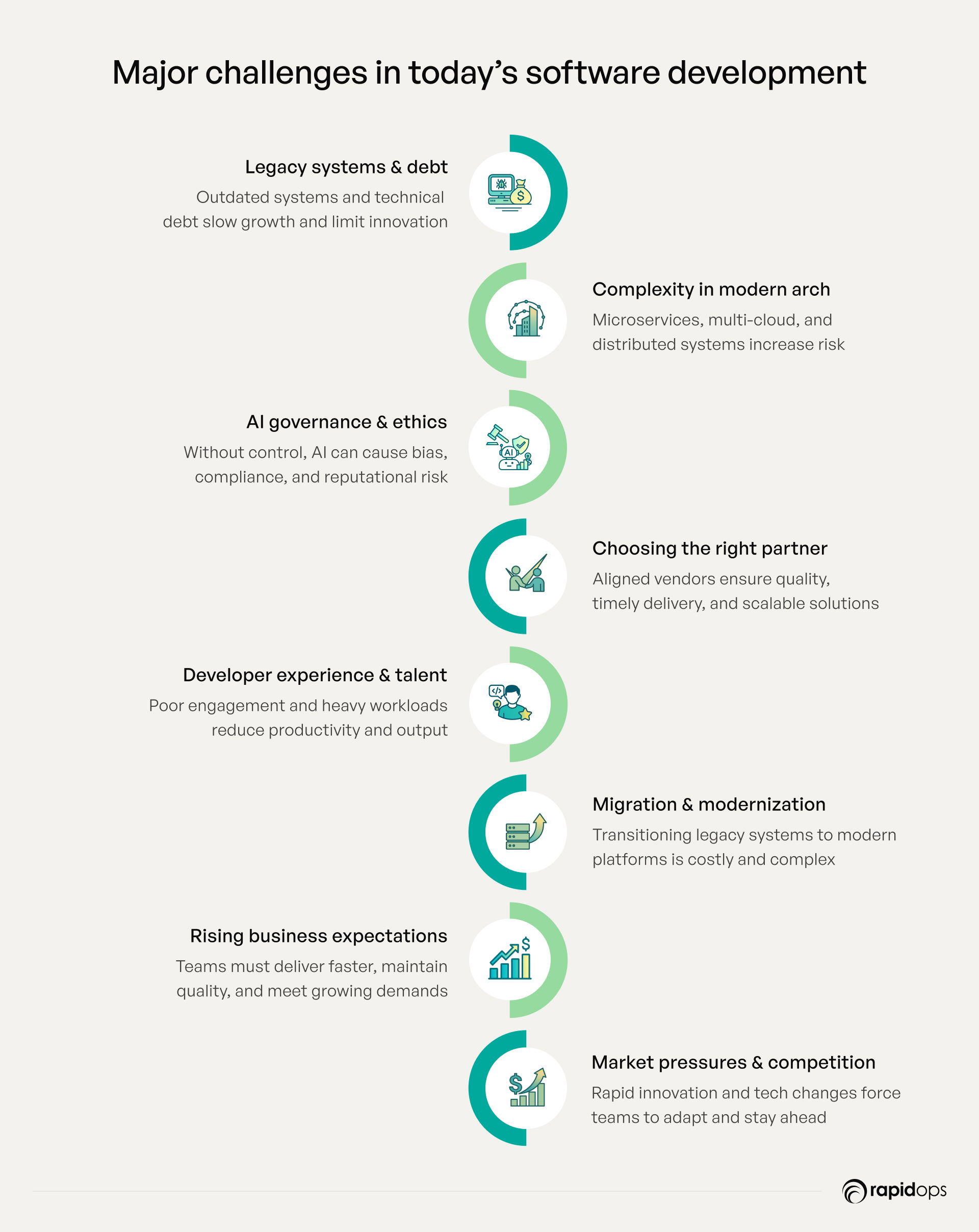 In 2025, software development is a strategic driver of growth, innovation, and competitive advantage, but organizations face a complex landscape of interconnected challenges that can slow delivery, elevate risk, and impact long-term business outcomes.