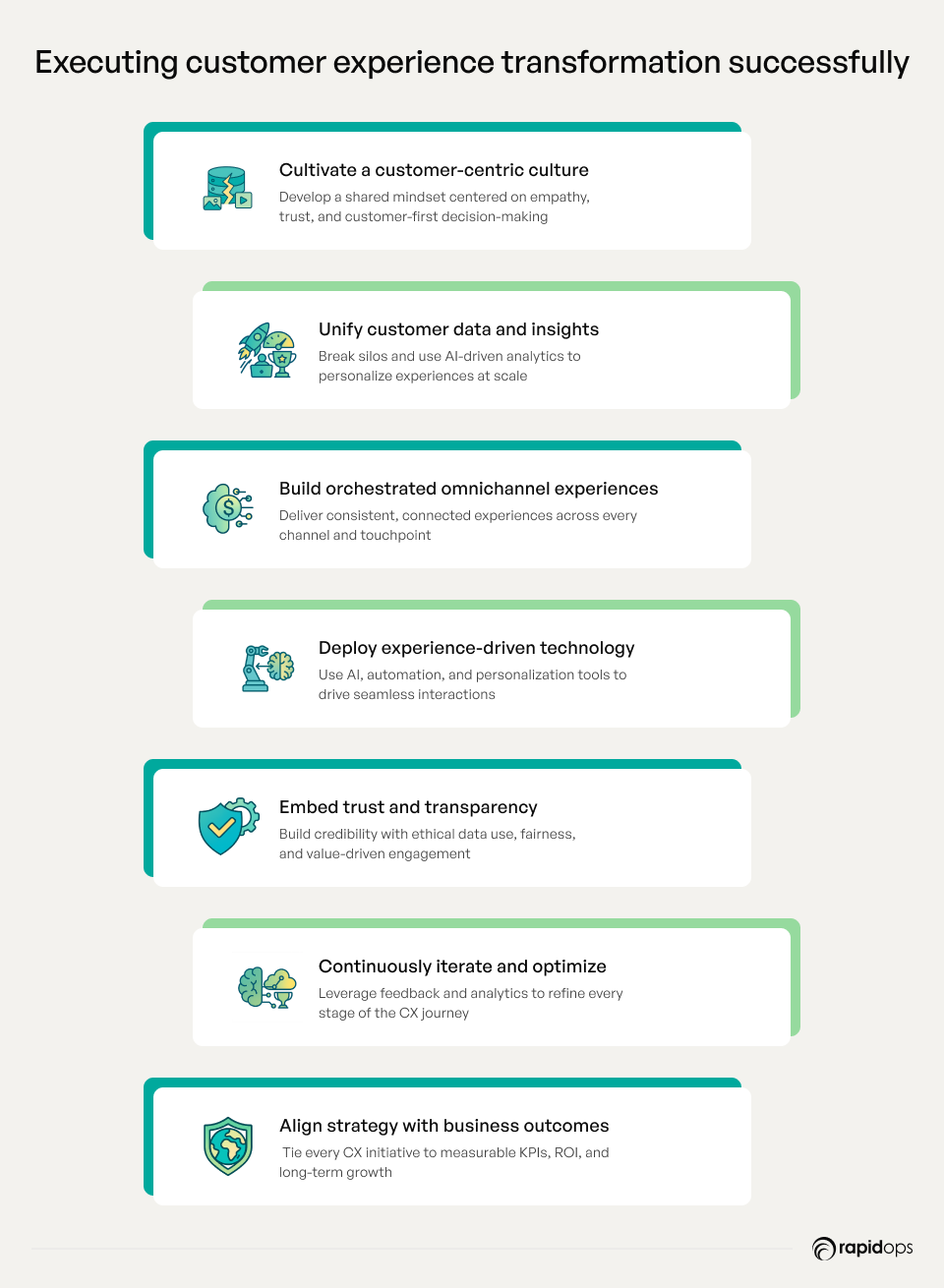 Implementing a customer experience transformation requires more than tools; it demands a unified vision, integrated systems, and a customer-centric mindset that is embedded across the organization.