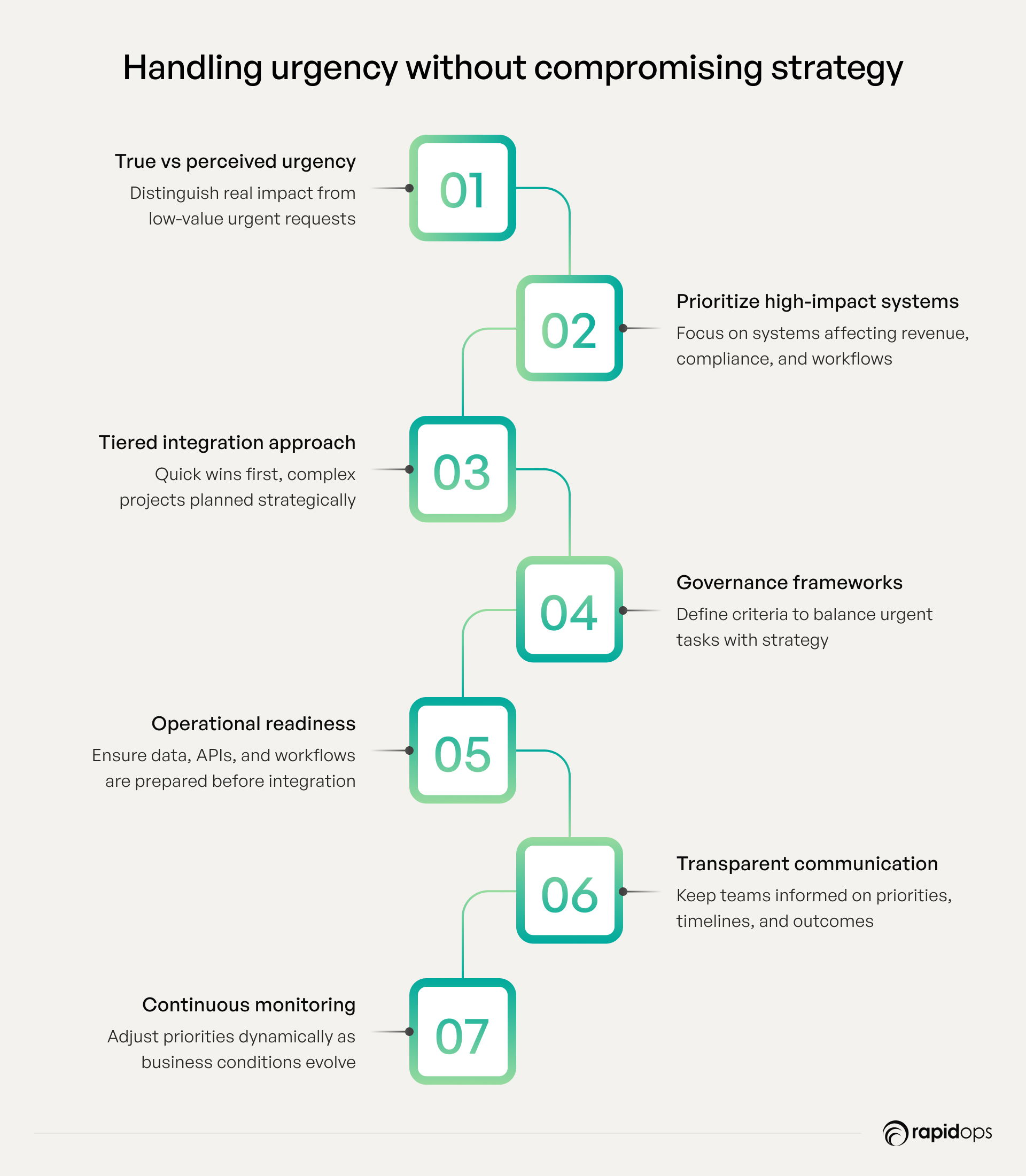 In high-pressure environments, the instinct is often to integrate every system immediately. However, reacting solely to urgency can fragment workflows, increase operational risk, and dilute strategic impact. Handling urgency effectively requires balancing short-term operational needs with long-term business objectives, ensuring that integration initiatives remain both timely and strategically aligned.