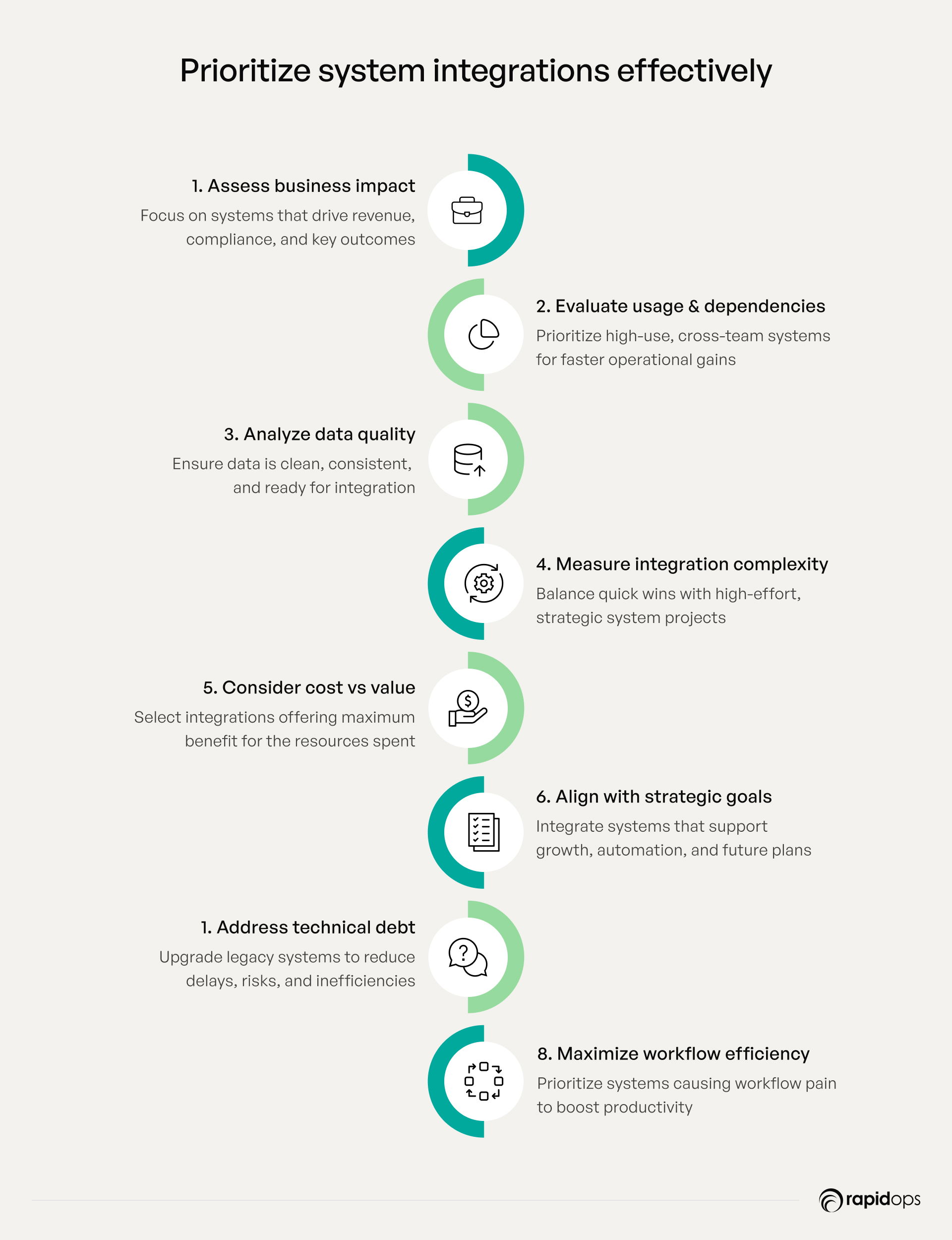 Short-term integrations that fail to account for future business expansion, automation, or AI initiatives may require costly rework later. Prioritization must include long-term strategic considerations, ensuring that integrated systems support organizational growth and evolving digital transformation objectives.