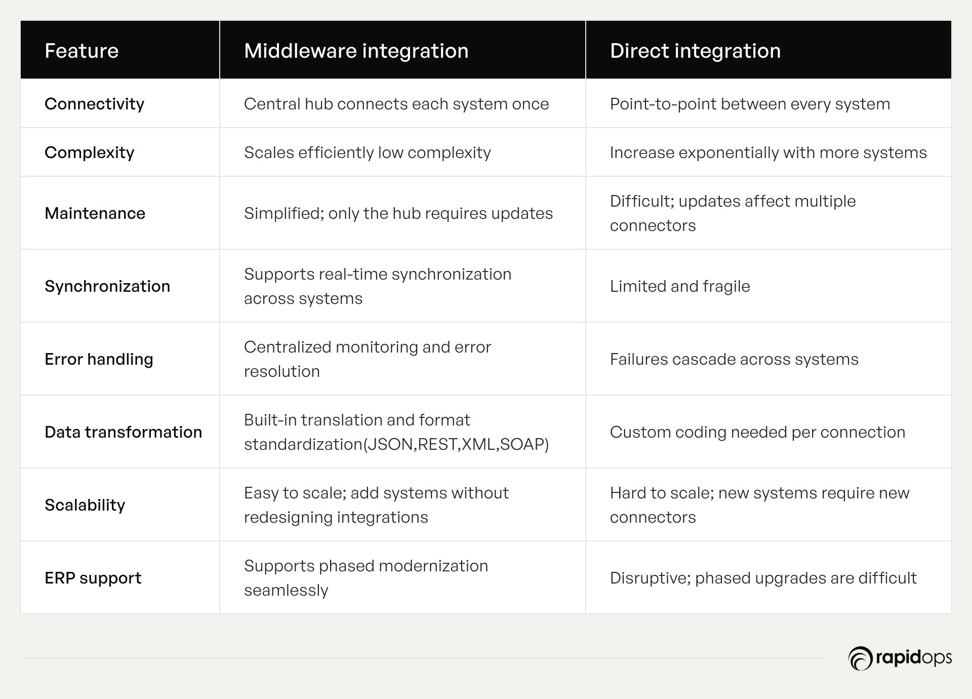 Direct integration requires custom point-to-point connectors between every pair of applications. In modern environments with legacy systems, multiple ERP systems, and cloud-based ERP solutions, this approach quickly becomes unmanageable.