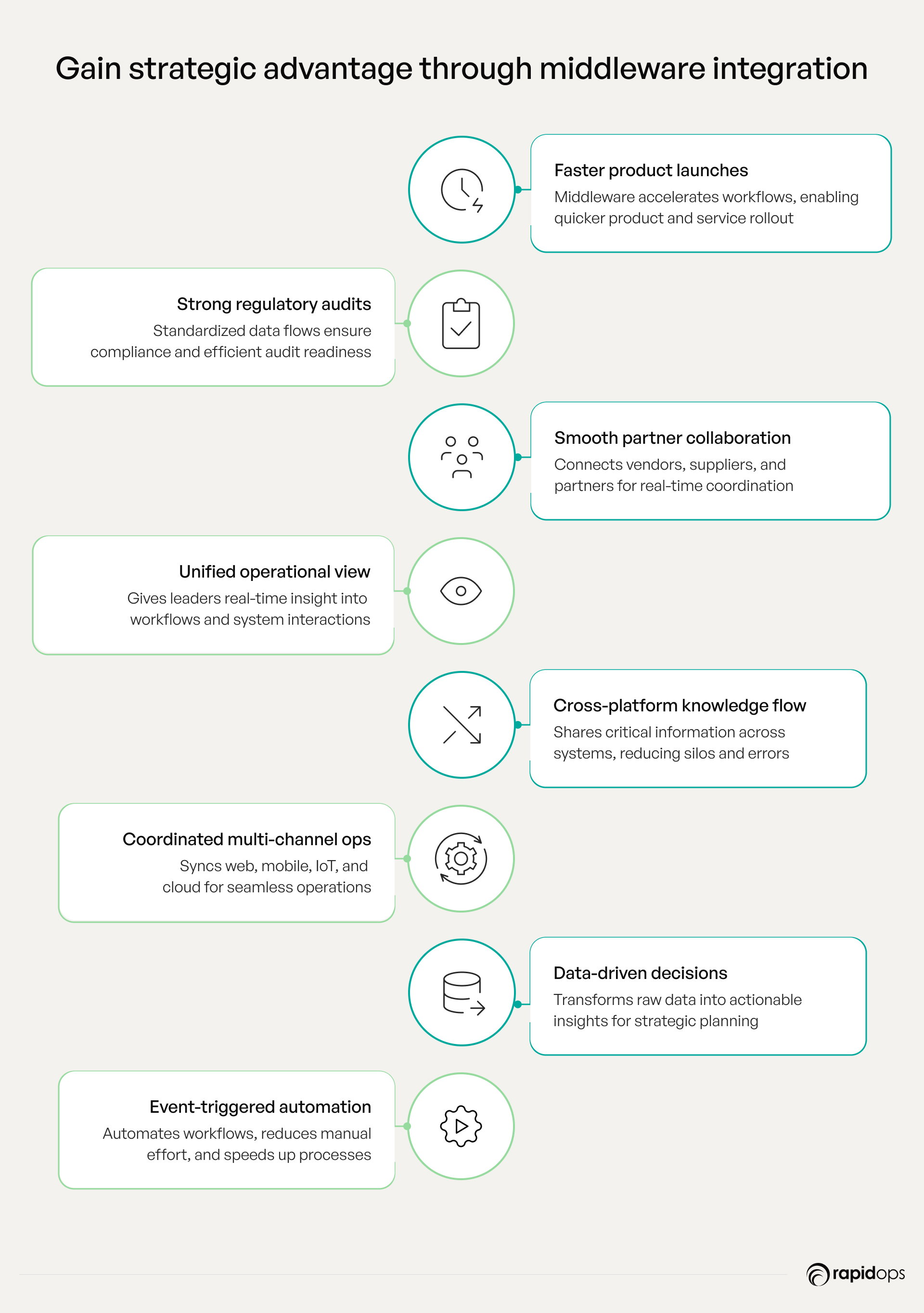 Middleware affects more than development teams. Its functions impact ERP data management, business processes, and decision-making. By enabling real-time data sharing, predictive analytics, and automation, middleware allows executives, analysts, and operational managers to respond faster, allocate resources efficiently, and scale operations without manual delays, generating tangible business value.