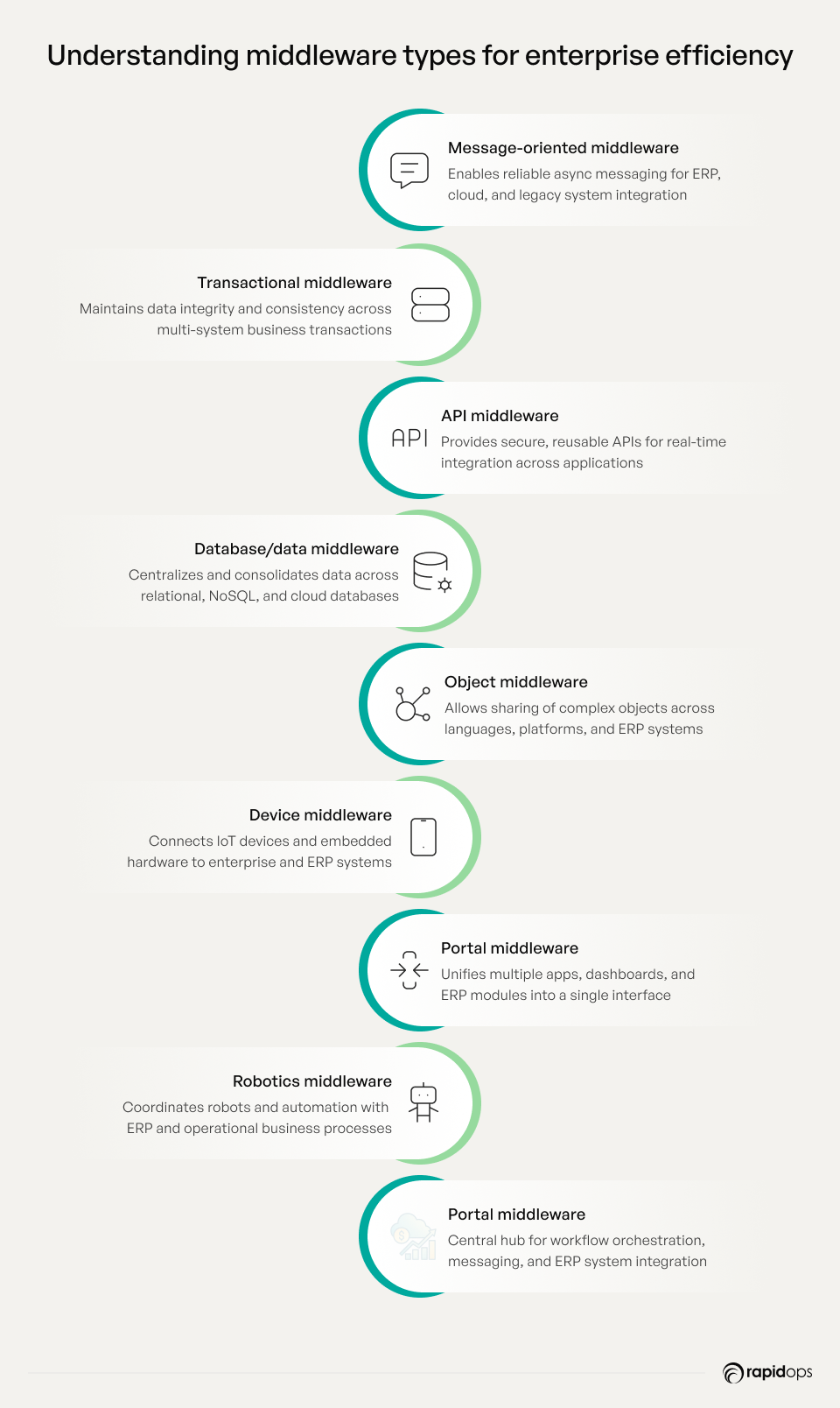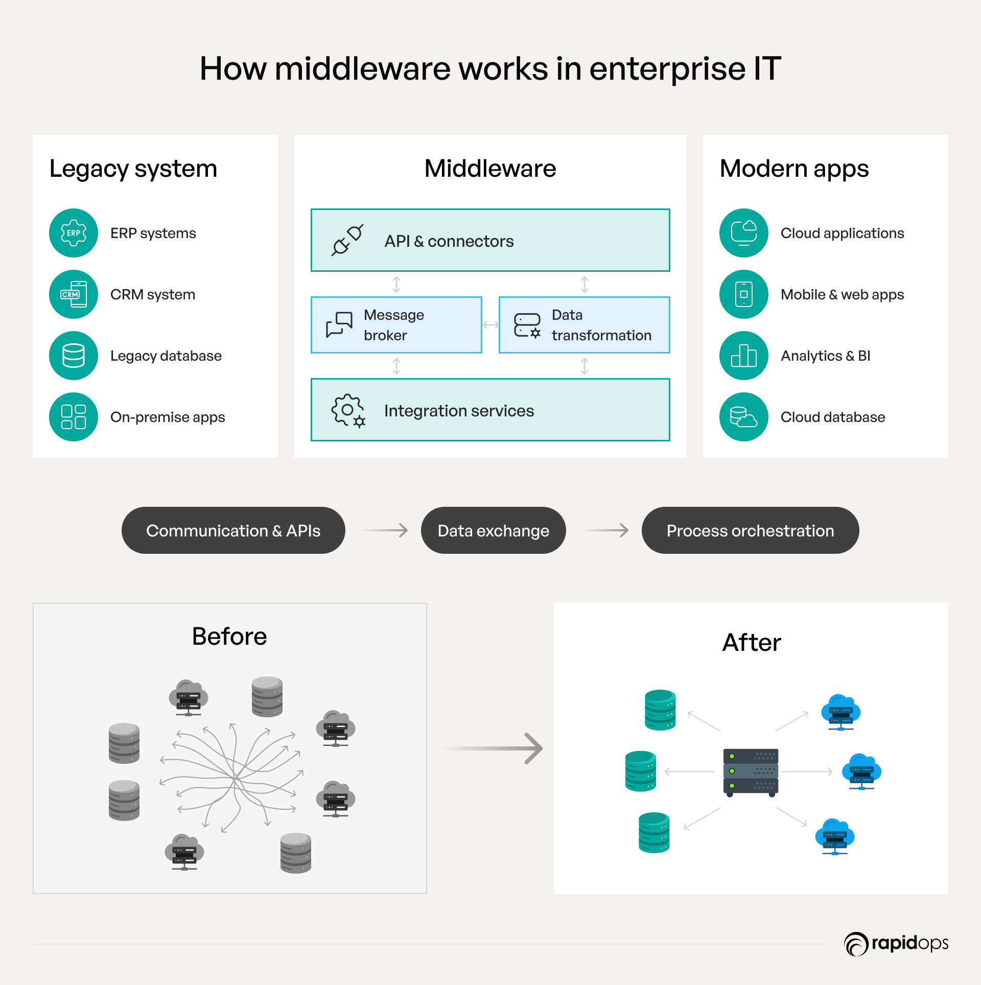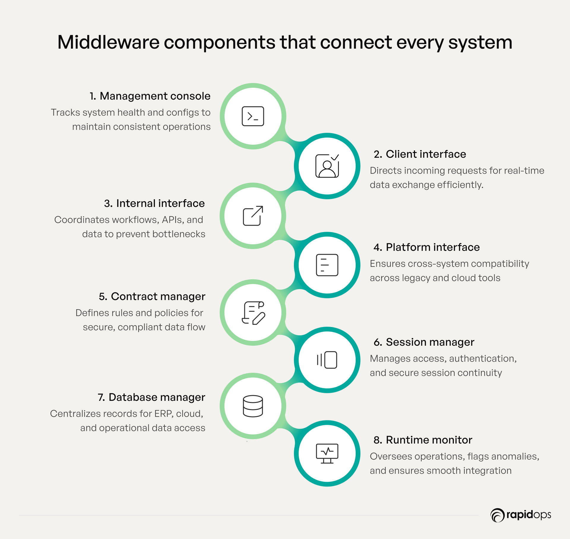 Middleware actively manages data and workflows to maintain operational efficiency, security, and reliability: